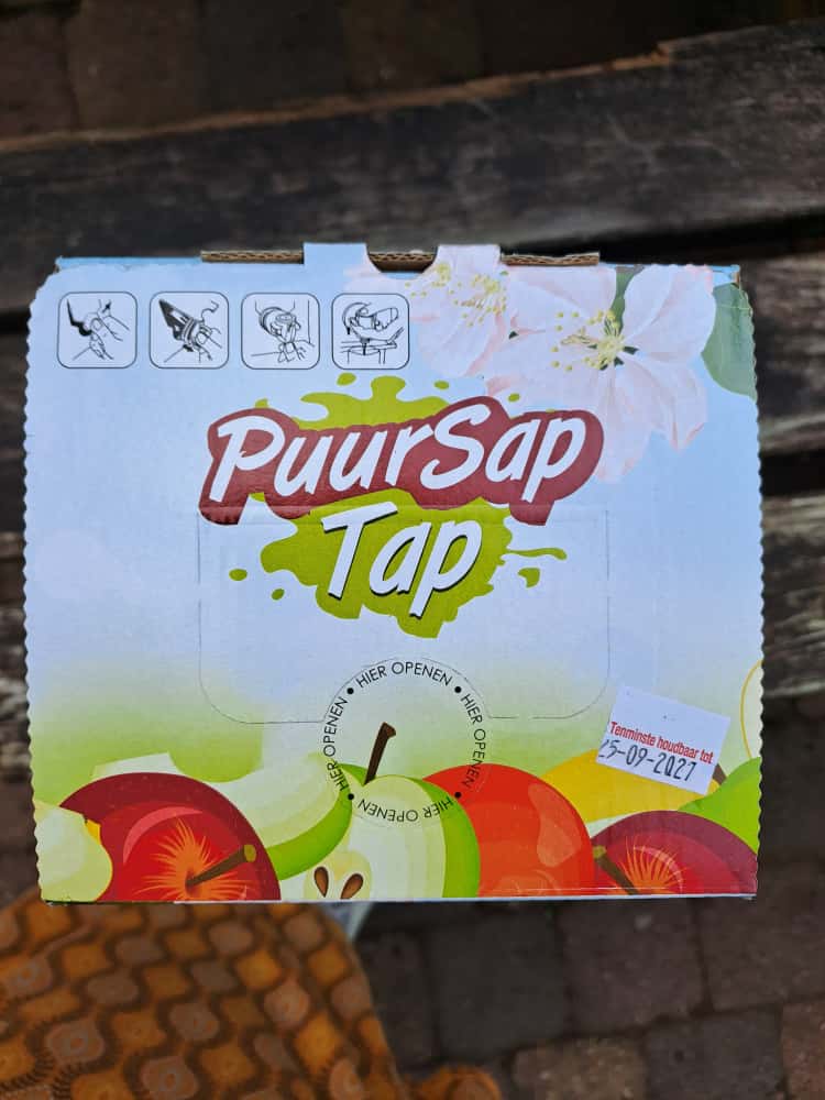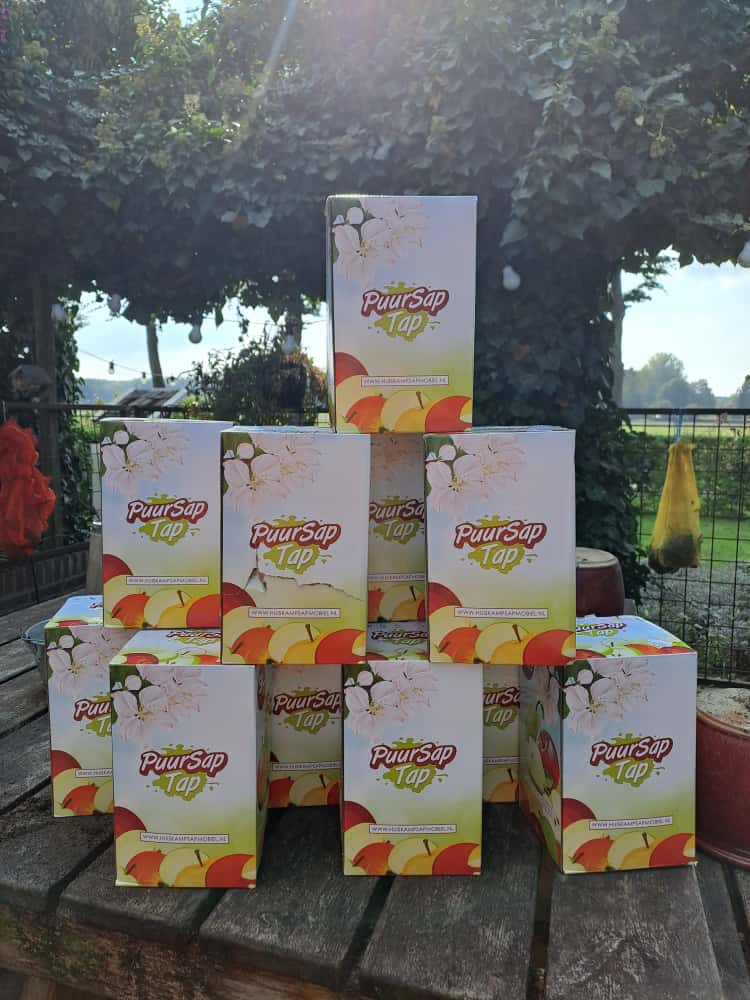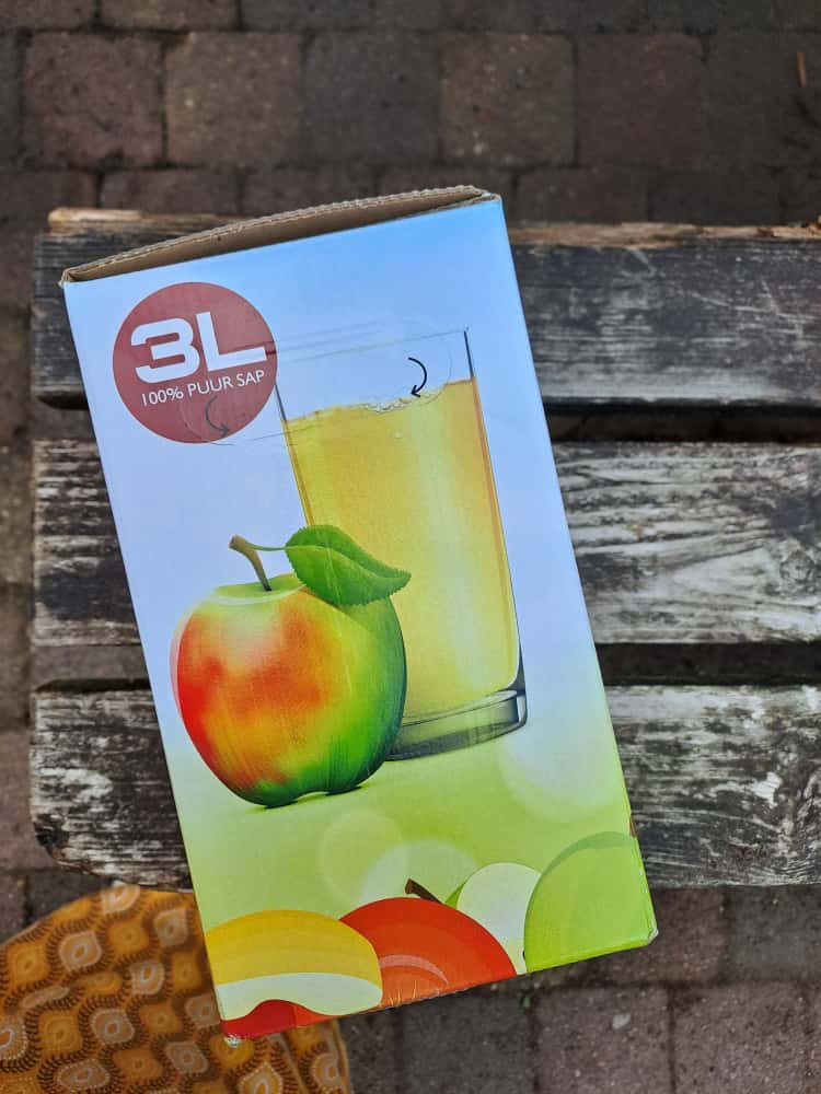 De kartonnen dozen staan niet altijd in de kraom, maar die heb ik wel in mijn kelder staan voor de verkoop. Bel dus even aan. In de kroam heb ik wel diverse glazen flessen/flesjes/potjes met appelsap staan. Die heb ik zelf in mijn keuken verpakt en zijn ook zonder toevoegingen.